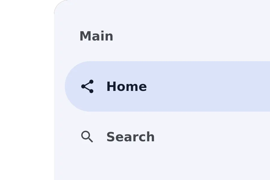 import { NavigationDrawer } from "@material";export component Example inherits Window { width: 400px; height: 300px; background: transparent; navigation_drawer := NavigationDrawer { width: 280px; height: parent.height; groups: [ { title: "Main", items: [ { icon: @image-url("../icons/share.svg"), text: "Home" }, { icon: @image-url("../icons/search.svg"), text: "Search" } ] } ]; }}